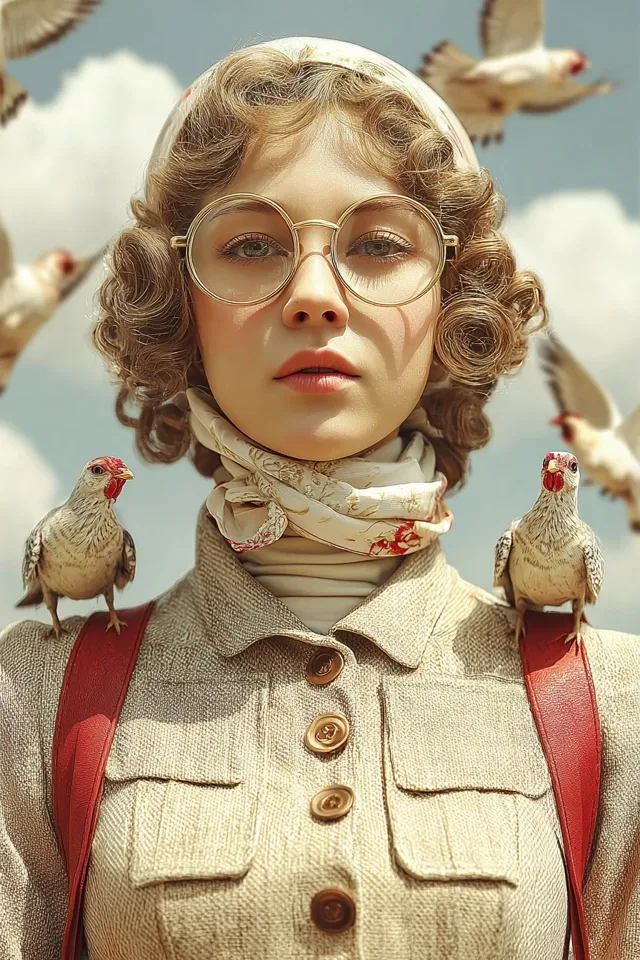 Tavuklar ve uçan kuşlarla birlikte bir kadının yer aldığı, sürreal ve vintage tarzda bir portre.