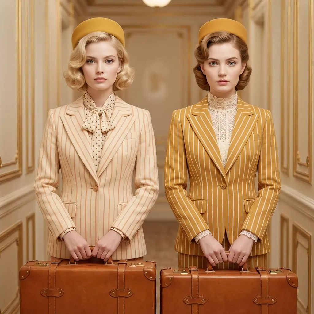Lüks bir ortamda, retro hostes üniformaları giymiş iki kadının elinde vintage bavullar tuttuğu nostaljik bir sahne.